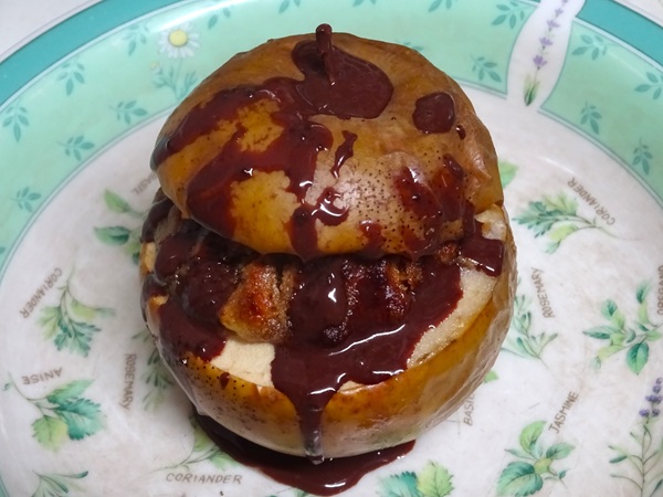 ブラートアプフェル(2026年2月21日) リンゴ 1個 クルミ 10g アーモンド 10g バター 5g 黒糖 小さじ1 蜂蜜 小さじ1 レモン汁 小さじ1 ブランデー 小さじ1 シナモン 少々 チョコレートソース 適量 ホーム スイーツ